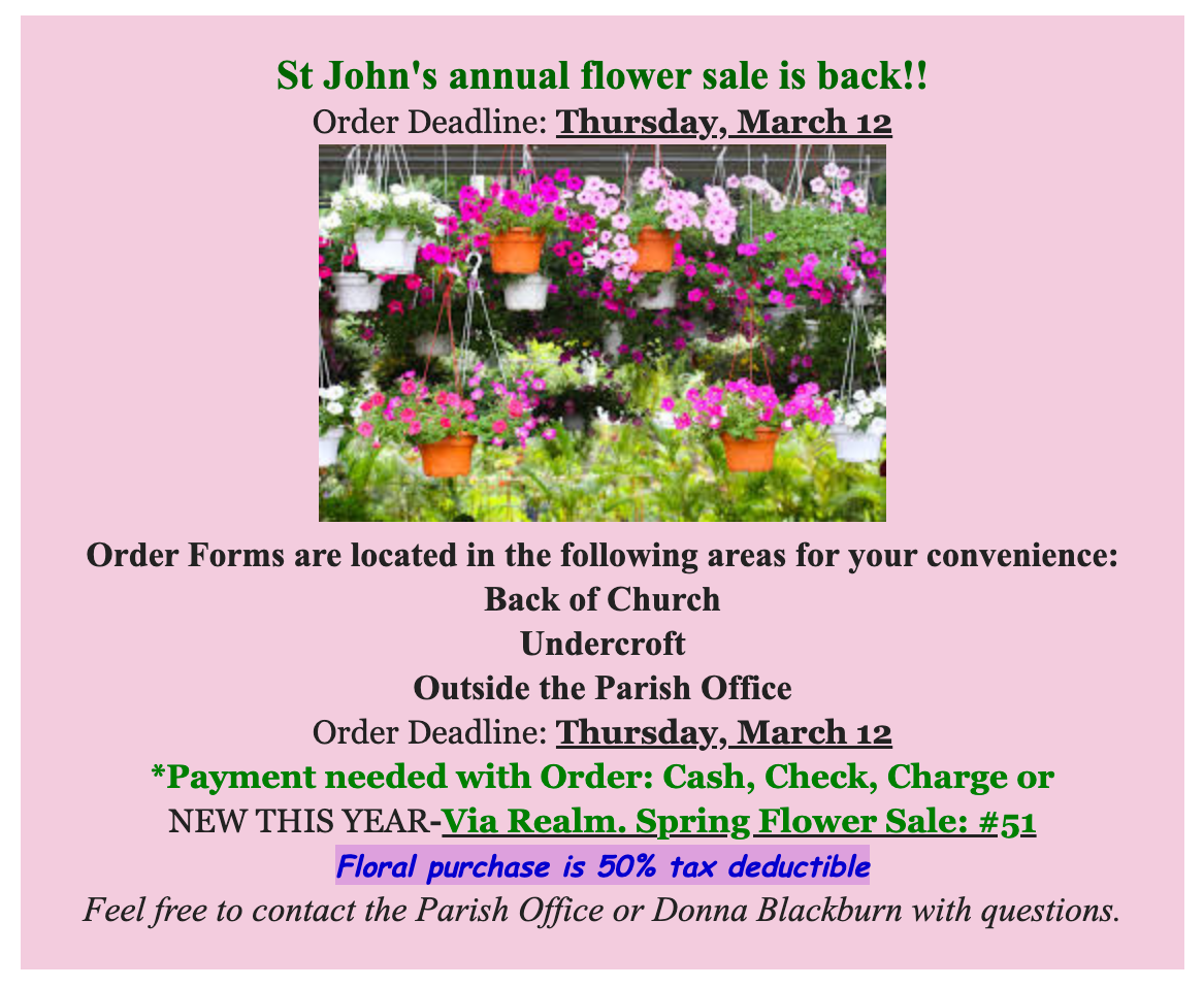 At St. John's there's a place for everyone to connect, through worship, fellowship, or service. Check out the Parish Calendar to see what's going on and for more information about how you can get involved.